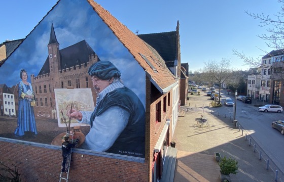 Das Dijkpoort in Hattem war Teil der Stadtbefestigung, die um 1400 aus mehreren Toren und Verteidigungstürmen bestand. Das Wandgemälde zeigt Großvater und Enkelin im ersten Stock dieses Dijkpoort. Während der Großvater alle verkauften Waren aufschreibt, spielt die Enkelin mit Hattem-Tonhühnern. Hattem war früher bekannt für den Handel und die Herstellung von Ziegelsteinen. Die übrig gebliebenen Tonstücke nahmen die Arbeiter mit nach Hause und rollten sie zu Hause zu Kugeln, die sie dann abbrannten und den Kindern als Murmeln schenkten. Im Hintergrund sehen Sie ein Gemälde von Jan Voerman, einem bekannten Maler aus Hattem, dessen Kunst noch heute im Voerman-Stadtmuseum Hattem zu bewundern ist. Das Gemälde zeigt Kühe und Auen, eine Anspielung auf das Gebäude, auf dem das Wandbild gemalt wurde. Das Aparthotel war früher ein städtischer Bauernhof, mit Kühen im hinteren Teil und Wohnungen im vorderen Teil. Die Kühe wurden von den Auen in die Stadt gebracht und in den Stall gebracht. Abgebildet sind auch Bonbons aus der berühmten Chocolaterie Hattem.